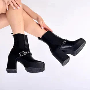 El diseño Amara es un botín de plataforma con tacón alto y un aire arriesgado y glamuroso. Está fabricado en cuero sintético que combina la solidez del material con el estilo llamativo de las aplicaciones metálicas tipo tachón y una correa con hebilla que rodea el empeine. La plataforma y el tacón grueso garantizan estabilidad al caminar, mientras que su diseño estiliza y alarga la figura. Este botín es ideal para quienes buscan impactar con un calzado que fusiona moda y comodidad. Si se desea en cuero genuino, se realiza en un cuero negro liso para ofrecer un extra de calidad sin perder su esencia atrevida.