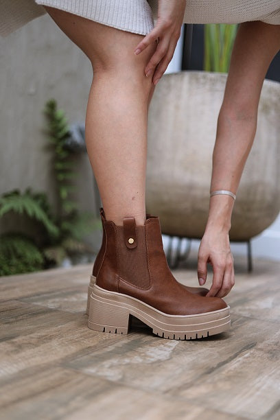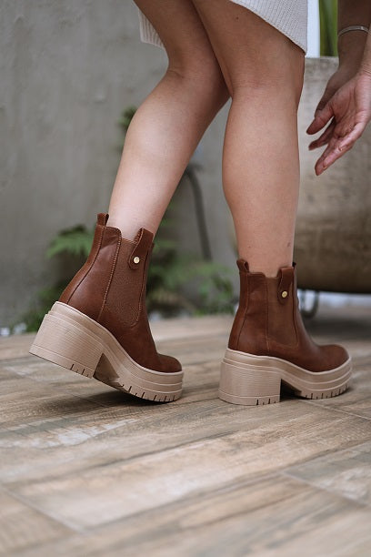 Alice es un botín de estilo casual con un toque moderno, ideal para elevar tus looks del día a día. Su diseño combina una plataforma robusta y un tacón cuadrado que brinda altura y comodidad. Este modelo puede elaborarse en cuero genuino o cuero sintético, según tu preferencia. Aunque se puede realizar en otros colores, solo contamos con fotos del diseño original en tono café. Incorpora un elástico lateral con aplique dorado que facilita el calce y añade un detalle sofisticado. La suela en tono beige con diseño dentado no solo ofrece un contraste elegante, sino también un excelente agarre. Este diseño está disponible en tallas de la 35 a la 40 y no se permite personalización en la altura del tacón.