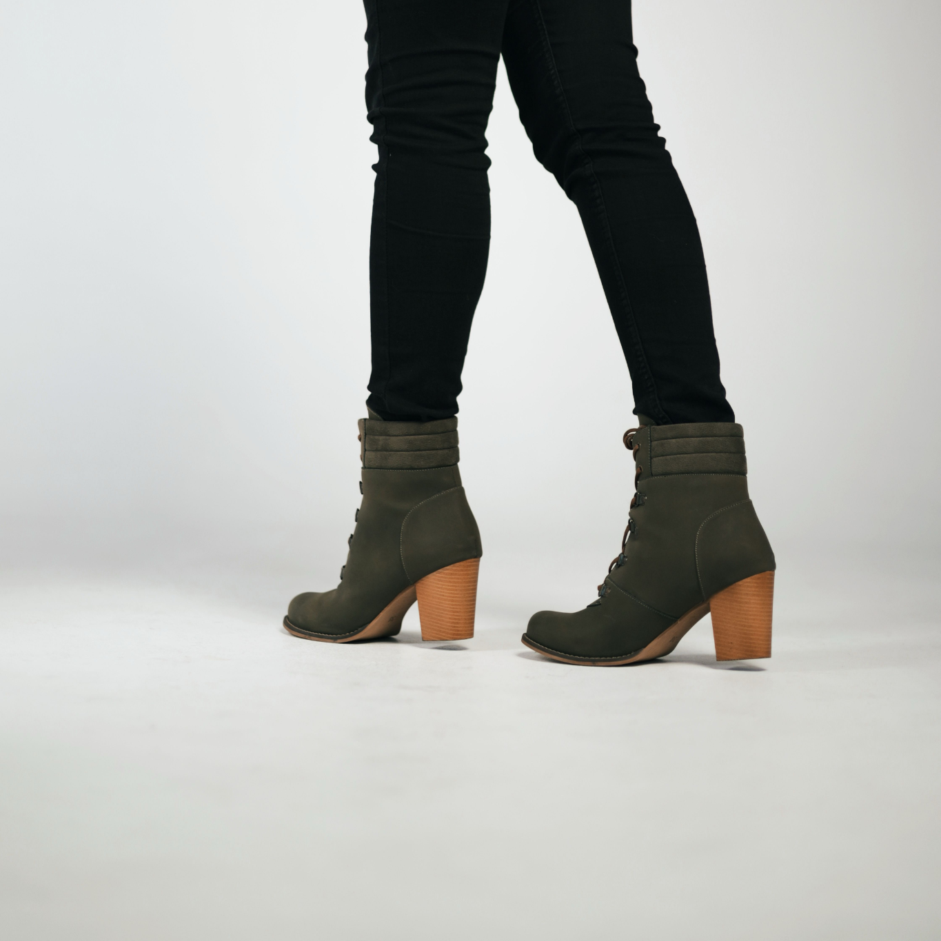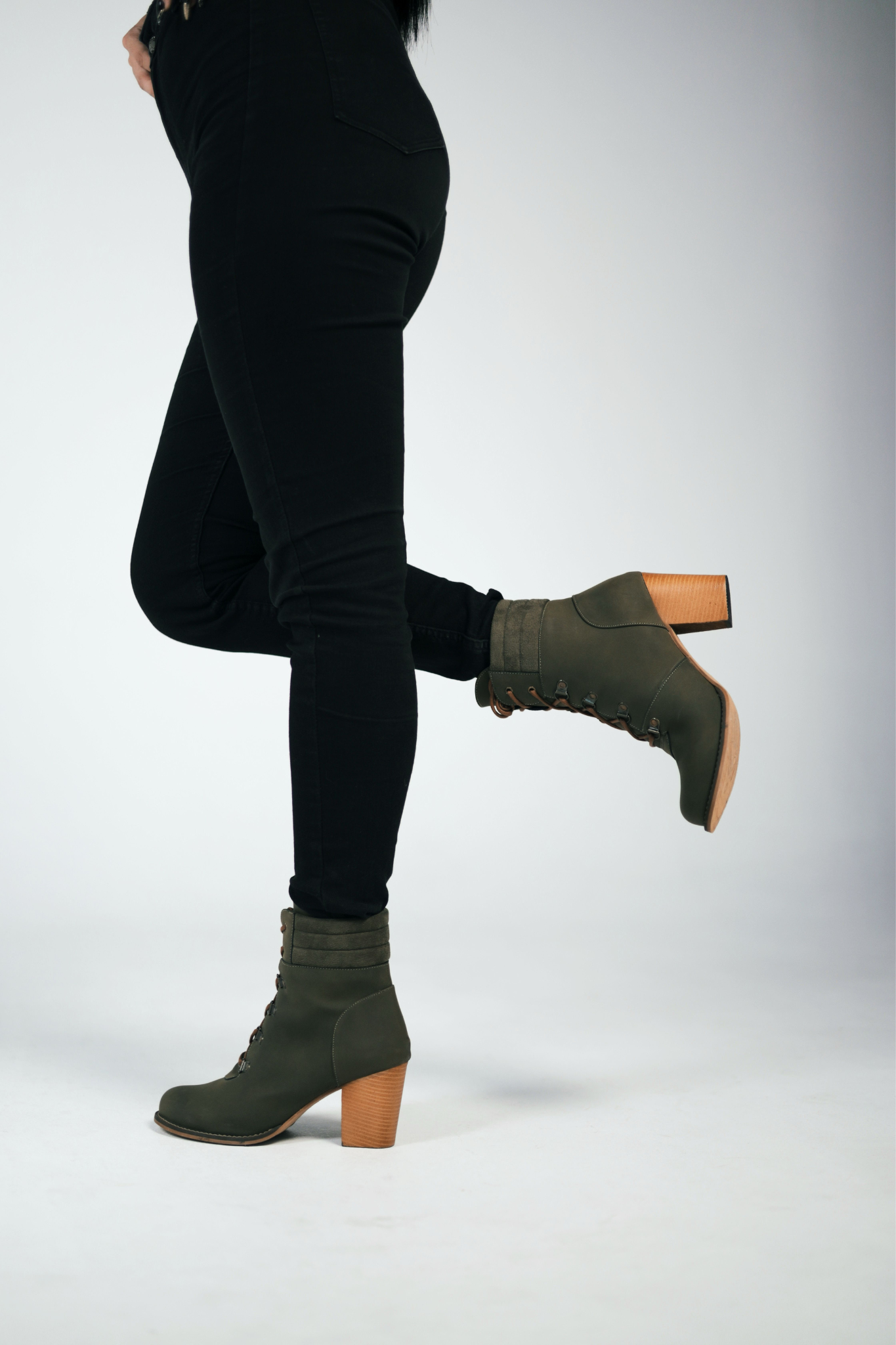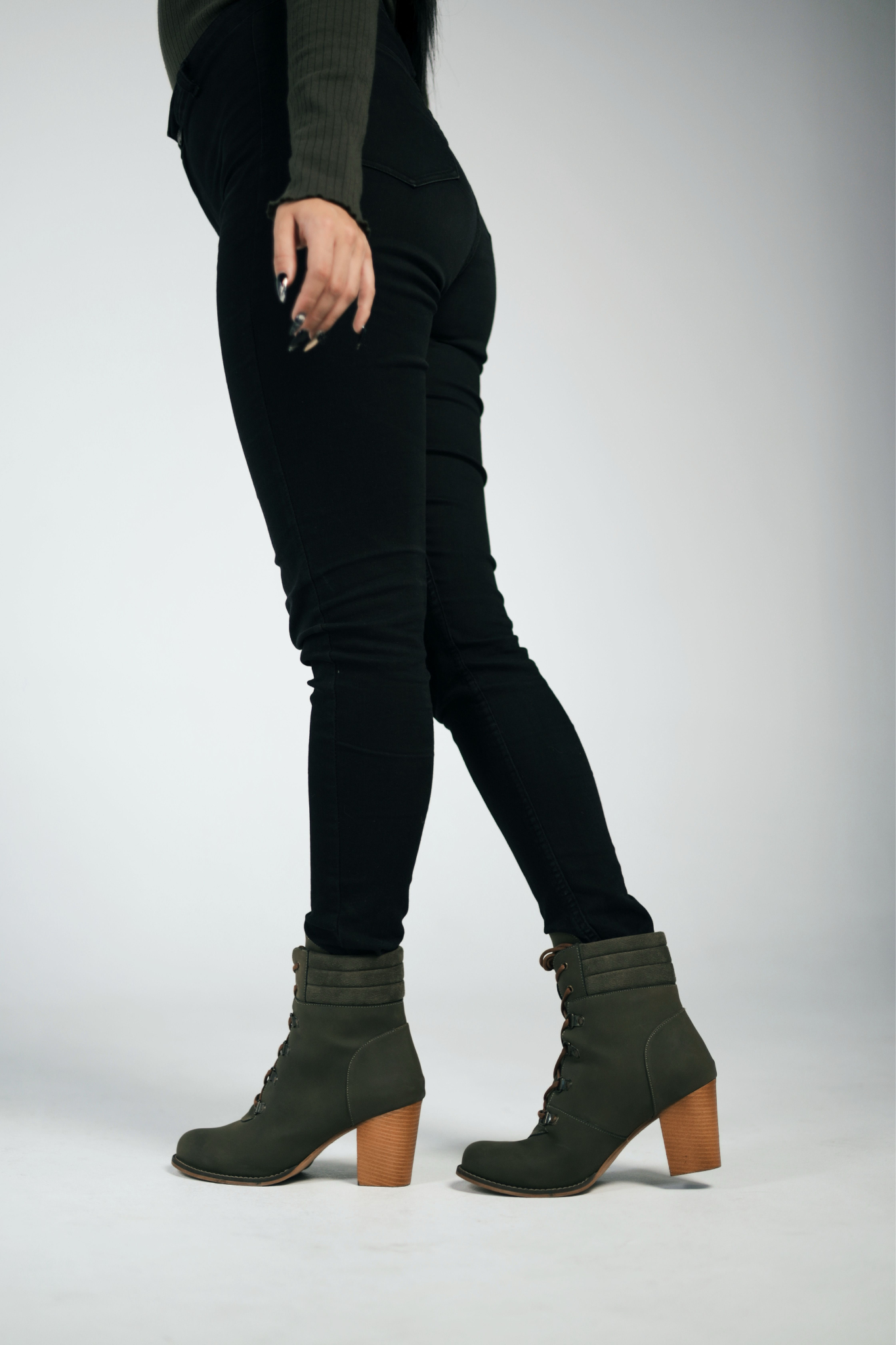 Beira es un botín con cordones frontales y tacón grueso estilo madera, que destaca por su estilo casual y versátil. Este diseño está elaborado en gamuza de cuero genuino (el acabado aterciopelado del lado interno del cuero natural, que ofrece mayor durabilidad, elegancia y un tacto premium) o en gamuza sintética (también conocida como suede sintético o microfibra gamuzada, opción vegana, más económica y de fácil mantenimiento, aunque con menor resistencia al desgaste). El material es el mismo que manejamos en el diseño Sky. El color base del modelo original es verde oliva, pero si deseas se puede hacer en otro color; contamos con el material en el tono que elijas, aunque no tenemos foto del diseño en colores diferentes al original