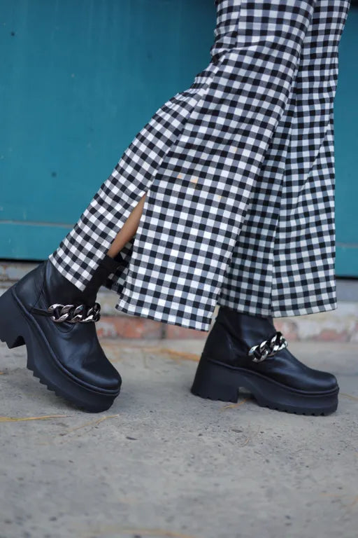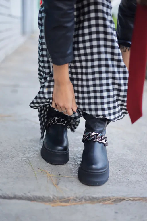 Nadya es un botín con plataforma gruesa y diseño urbano que combina estilo y actitud. Su caña media ajustada y la gran cadena decorativa metálica sobre el empeine lo convierten en un calzado con personalidad fuerte, ideal para destacar en cualquier look. La suela tiene un grabado profundo para un mejor agarre y el diseño incluye cierre lateral para facilitar el calce. Este modelo está disponible en cuero sintético o cuero genuino, en tallas de la 35 a la 40. No es posible modificar la altura de la plataforma, el tipo de suela ni el detalle de la cadena metálica. El color base es el que se muestra en las imágenes y, aunque se puede consultar la disponibilidad en otros tonos, únicamente contamos con fotos del diseño base y en caso de cambios solo podríamos mostrar el tipo de cuero que se utilizaría.