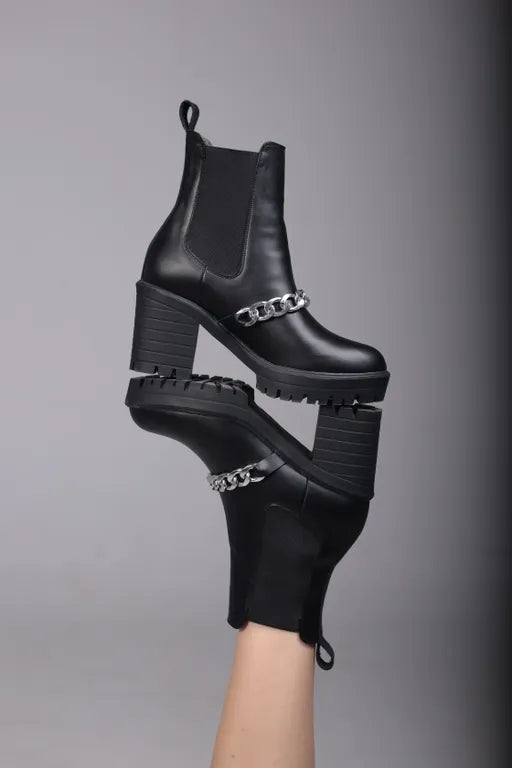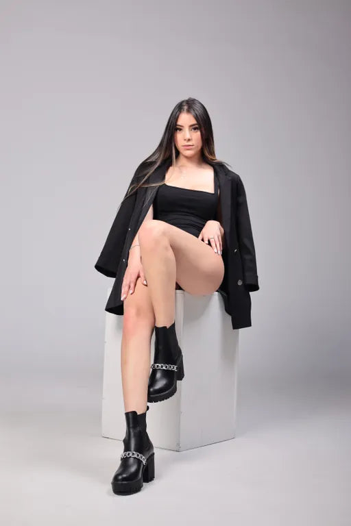 Es un botín negro de caña media con un diseño imponente que combina plataforma y tacón ancho para ofrecer altura y máxima estabilidad. Su detalle distintivo es la cadena metálica decorativa al frente, que le aporta un toque moderno y urbano perfecto para quienes buscan un calzado con personalidad. Este modelo está disponible en cuero sintético o cuero genuino, ambos de alta calidad, y cuenta con una suela antideslizante que mejora la tracción al caminar. La estructura del diseño no permite modificaciones en la altura, la forma de la caña ni el detalle de la cadena. En caso de solicitar un tono distinto al que se muestra en las imágenes, únicamente se podrá compartir la foto del material elegido, ya que no se cuenta con imágenes del botín terminado en otros colores.