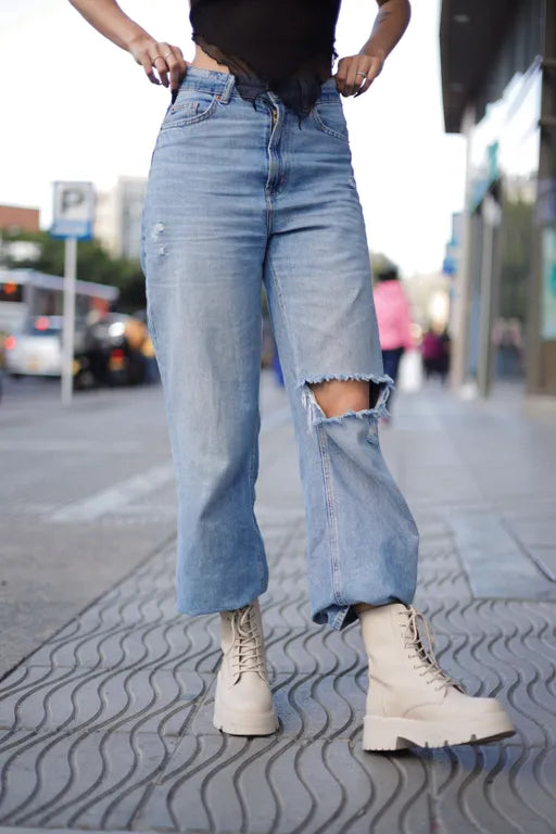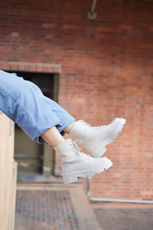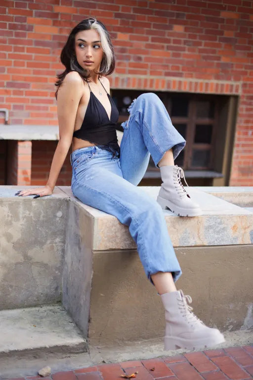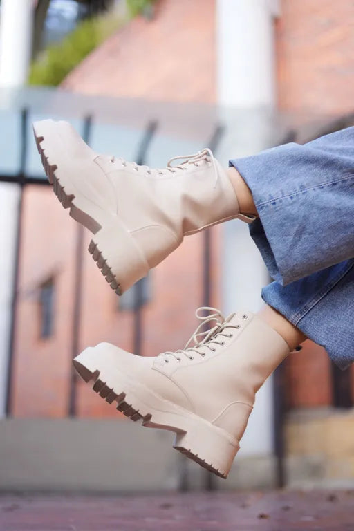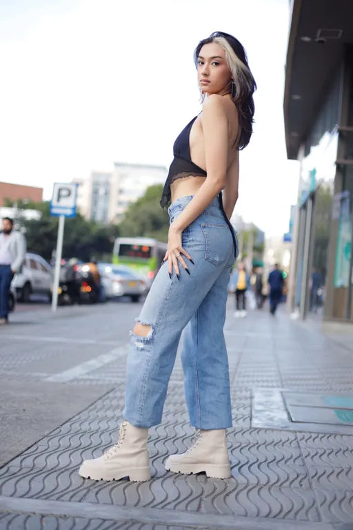 Rainey es un botín tipo combat con un diseño urbano y moderno que destaca por su suela robusta con grabado profundo para mejor agarre. Su silueta estilizada, el cordón frontal y la caña media le dan un look versátil y fresco, ideal para outfits casuales o con toques streetwear. Su plataforma ligera aporta altura y comodidad al mismo tiempo. Disponible en cuero sintético o cuero genuino, según la preferencia de la clienta.