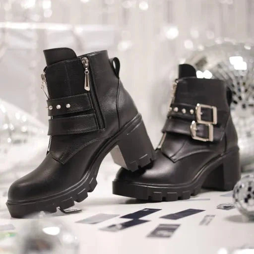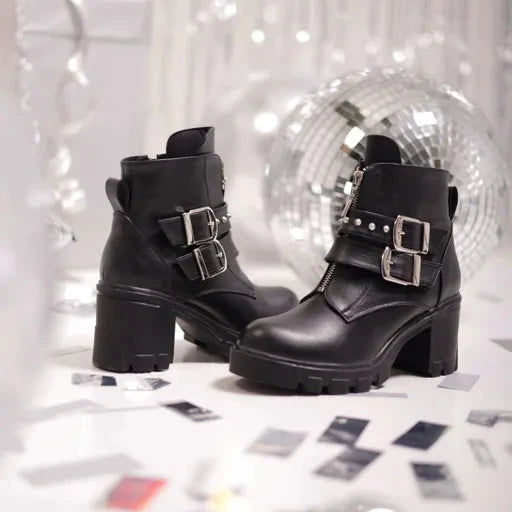 Dale un giro audaz a tus looks con los botines Riley, un diseño con carácter que combina funcionalidad y estilo. Elaborados en cuero sintético o genuino (según tu preferencia), destacan por su suela robusta tipo tractor, tacón cuadrado de altura media y doble correa con hebillas metálicas que aportan ese toque rebelde. El cierre frontal con cremallera y detalles de mini tachas metálicas realzan su aire rockero, mientras garantizan comodidad y firmeza al caminar. Perfectos para acompañar desde un outfit casual hasta uno más arriesgado.